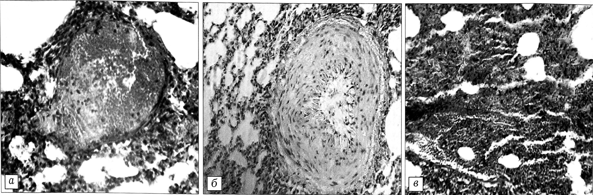 2. Rice. Fig. 1. Microscopic picture of the lung of a control group rabbit (stained with hematoxylin and eosin). a - rupture of the vessel wall (magnitude 240); b — spasm of the arteriole wall, swelling and desquamation of endotheliocytes (lev. 240); c — extensive hemorrhages in the parenchyma resembling a lung infarction (magnitude 140).