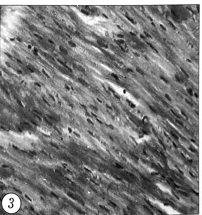 3. Rice. 2. Microscopic picture of the myocardium of a rabbit of the control group: against the background of fragmented cardiomyocytes with symptoms of protein dystrophy, multiple hemorrhages are visible (staining with hematoxylin and eosin, magn. 140).