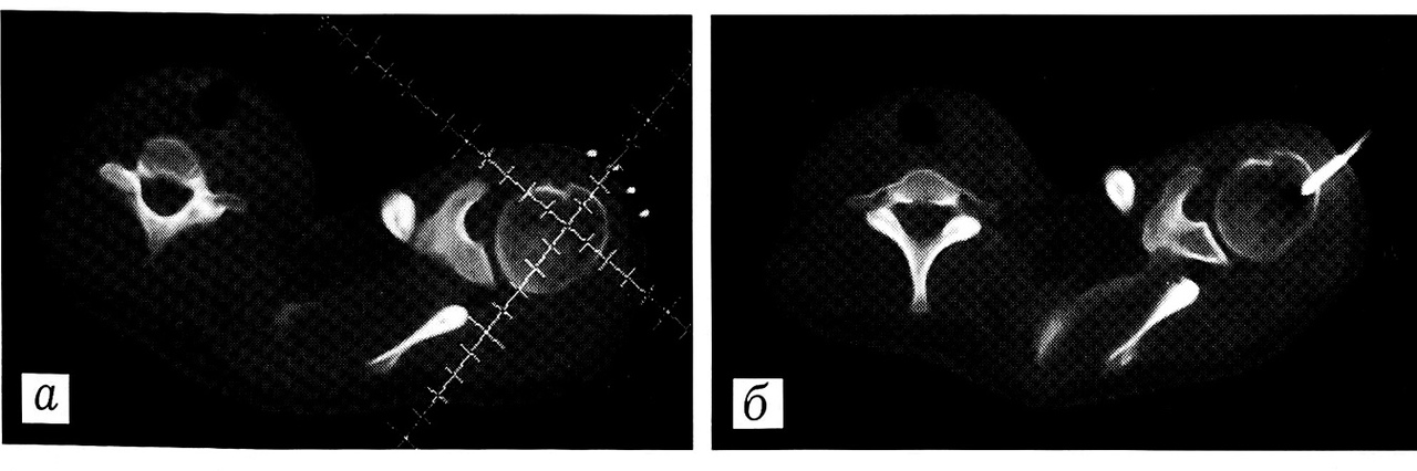 Рис. 2. Больной Г. Метастаз плоскоклеточного рака Т2 позвонка. Прицельная биопсия под контролем КТ с использованием разработанного устройства.