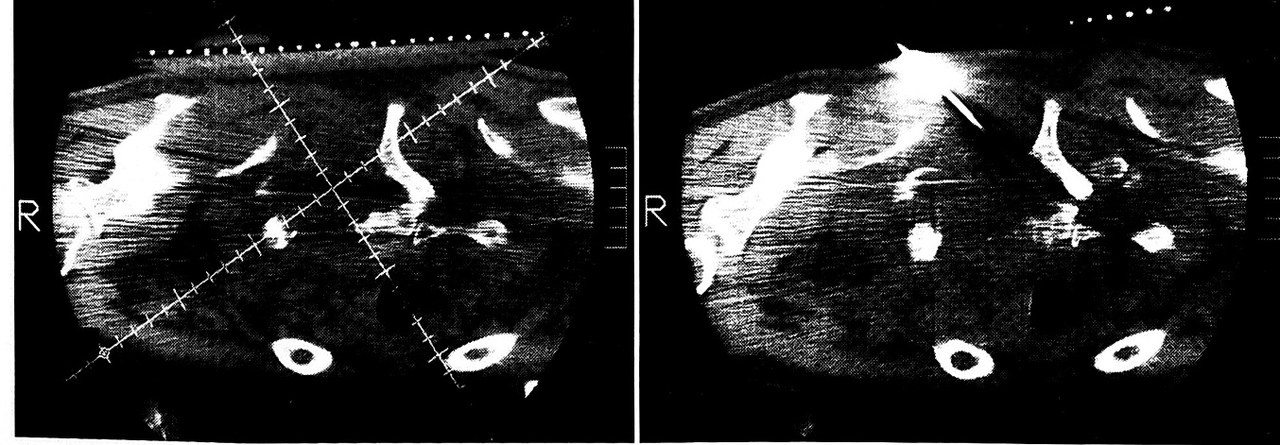 Метод прицельной биопсии под контролем КТ включал несколько этапов. Предварительно проводилось диагностическое сканирование срезами, шаг и толщина которых варьировали в зависимости от протяженности патологического процесса (5-10 мм). Это позволяло определить топографию образования, его взаимоотношения с прилежащими органами. Далее выбирался срез, оптимальный с точки зрения выраженности рентгенологических признаков заболевания и минимальной травматичности проведения прицельной биопсии. На выбранном уровне накожно закреплялись перпендикулярно световому лучу рентгеноконтрастные маркеры и проводилось повторное сканирование. По полученной томограмме уточнялось наиболее удобное положение трепана: рассчитывались точка его введения, угол наклона и глубина проникновения. Точка введения выбиралась таким образом, чтобы свести к минимуму изменение направления хода трепана в каудальную или краниальную сторону. Под местной анестезией осуществлялось чрескожное введение трепана. Контроль за месторасположением инструмента в операционном поле обеспечивался серией томограмм, производимых на уровне кончика трепана: промежуточная томограмма с определением его хода в мягких тканях, затем вторая промежуточная томограмма при достижении кости — для подтверждения правильности точки контакта с костью. После этого трепан продвигали вращательными движениями внутрь очага поражения до достижения расчетной глубины. Производили томограмму, документирующую участок забора материала (рис. 1). При необходимости коррекции положения трепана извлекали его и предпринимали повторную попытку биопсии. После забора материала при наличии показаний вводили лекарственные или контрастирующие препараты. Далее выполняли контрольное сканирование с целью оценки состояния исследованной области.