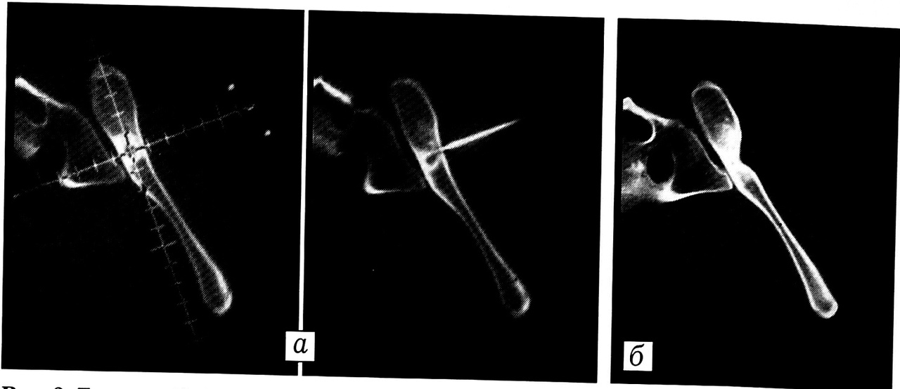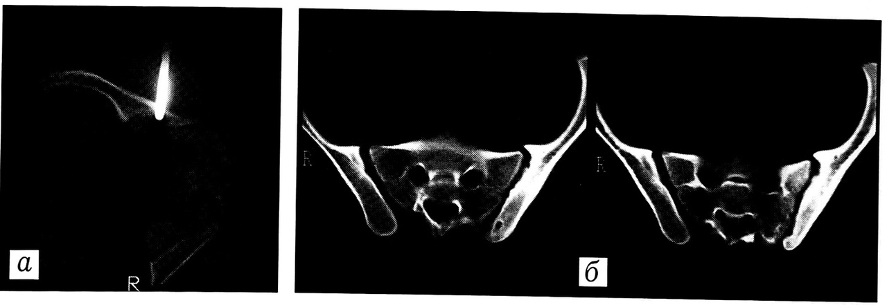 Рис. 3. Больная Б. Неспецифический хронический воспалительный процесс в заднем отделе правой подвздошной кости. Предоперационная разметка. а навигация «якоря» в очаг поражения; б — контрольное обследование через 14 мес.