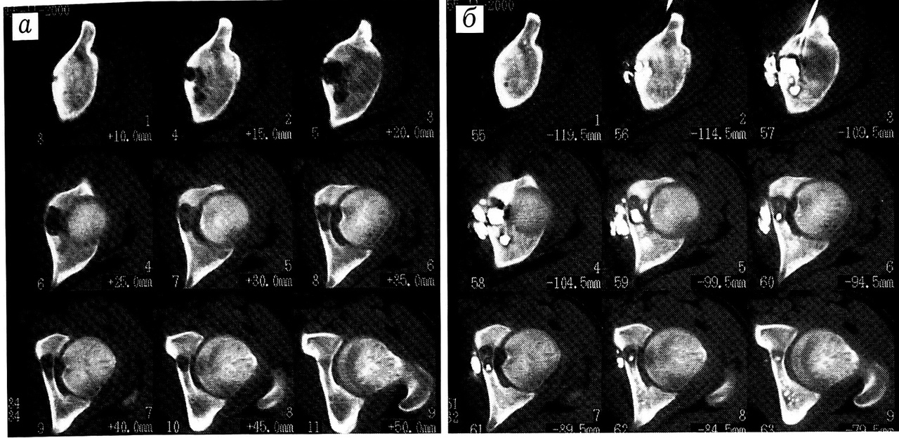 Рис. 1. Больная Д. Эозинофильная гранулема головки правой плечевой кости. Прицельная биопсия. a — расчет точки введения и угла наклона трепана с использованием рентгеноконтрастных маркеров; б — контрольная томограмма, документирующая участок забора материала.
