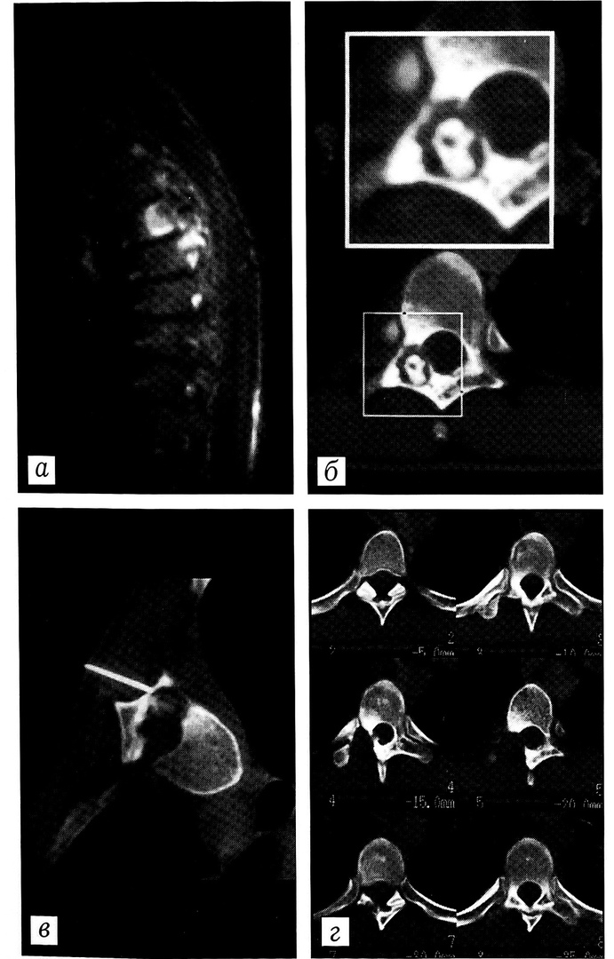 Рис. 7. Больной Ч. Интравертебральная остеоидная остеома корня правой дуги Тб позвонка. a — MPT: на Т2 ВИ определяется гиперинтенсивный сигнал от задних отделов тел и задних элементов Т5-7 позвонков; б — КТ: «гнездо» остеоидной остеомы в правых отделах дуги Тб позвонка; в — навигация «якоря» в «гнездо» остеоидной остеомы; г —контрольное обследование через 8 мес.