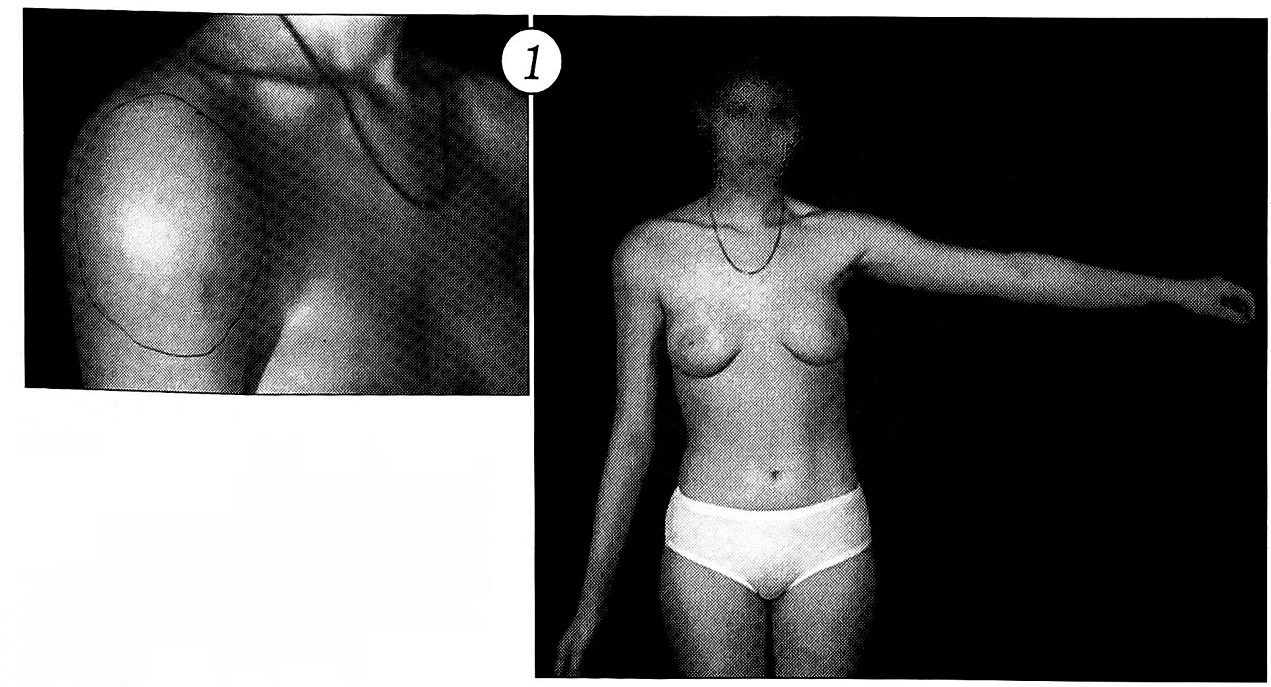 Рис. 1. Больная Г. 15 лет. Хондробластома головки правой плечевой кости. Припухлость в области правого плечевого сустава, ограничение движений в суставе.