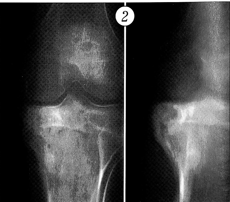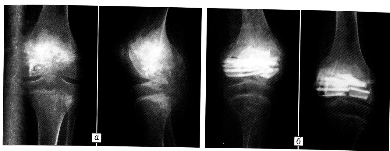 Рис. 7. Больная Т. 11 лет. Хондробластома дистального метаэпифиза левой бедренной кости. a — рентгенограммы до операции; б — после операции (внутрисуставная краевая резекция дистального метаэпифиза бедра, замещение дефекта кортикальными аллотрансплантатами в сочетании с губчатыми аллотрансплантатами, покрытыми хрящом).