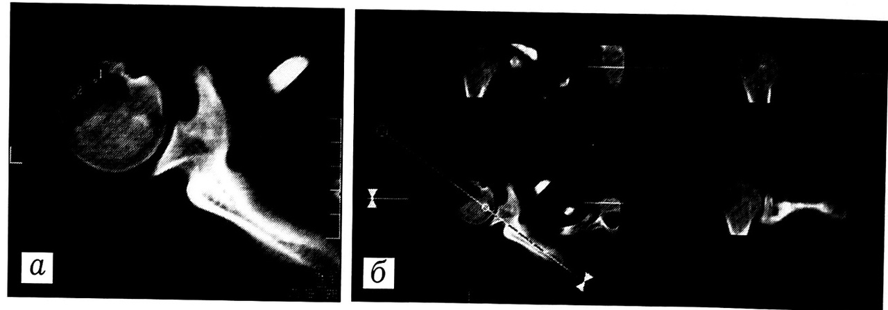 Рис. 3. Больной Р. 15 лет. Хондробластома проксимального метаэпифиза левой плечевой кости. a — компьютерная томограмма: остеолитический очаг деструкции; б — мультипланарная реконструкция изображения: разрушение ростковой пластинки в наружных отделах.