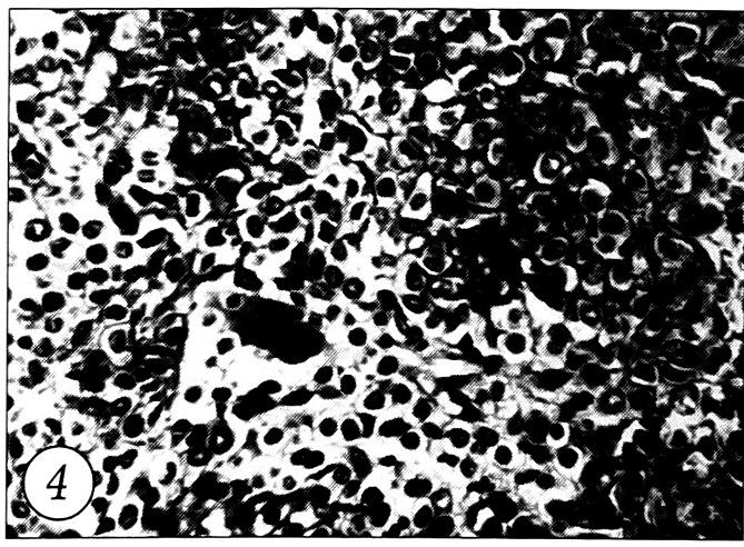 Рис. 4. Компактно расположенные хондробласты различной степени дифференцировки, между которыми видна многоядерная остеокластоподобная клетка (окраска гематоксилином и эозином, ув. 200).