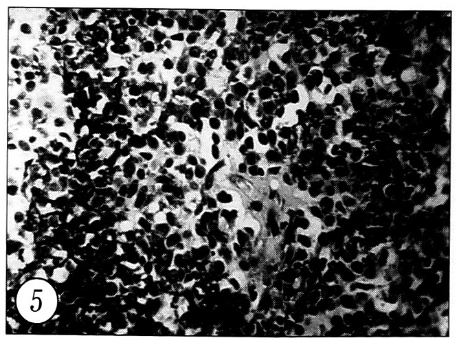 Во всех случаях диагноз верифицирован при морфологическом исследовании. Макроскопически ткань была серовато-желтого цвета, пропитана кровью, мягкой консистенции, с плотными крошащимися вкраплениями. Гистологически хондробластома характеризуется пролиферацией плотно расположенных хондробластов различной степени зрелости (рис. 4). Хондробласты круглой или овальной формы, с крупными ядрами, в которых ядрышки обычно не выявляются. В некоторых опухолевых клетках определяется 2-3 ядра, однако митозы немногочисленны, атипичные митозы не обнаруживаются. Поля незрелых хондробластов чередуются с участками более зрелых клеток, обычно лежащих в хондроидном матриксе. Кроме хондробластов, обнаруживаются небольшого размера многоядерные остеокластоподобные клетки — одиночные или их группы, иногда они располагаются вокруг участков микрокровоизлияний, некроза или обызвествления. Менее зрелые хондробласты по своей структуре имеют значительное сходство со стромальными клетками гигантоклеточной опухоли, а наличие в подобных участках хондробластомы многочисленных остеокластоподобных клеток может быть ошибочно расценено как гигантоклеточная опухоль [1]. Определяются соединительнотканные прослойки, делящие ткань опухоли на дольки. Характерным и важным диагностическим признаком хондробластомы является обызвествление ткани опухоли. При этом нежное сеточкоподобное отложение солей кальция происходит между незрелыми хондробластами и вокруг них (рис. 5), тогда как массивное обызвествление наблюдается в более зрелом матриксе гиалинового хряща, который подвергается дистрофическим изменениям и некрозу. В некоторых хондробластомах определяются выраженные миксоидные изменения, а также поля фибробластоподобных клеток. Иногда встречаются разной величины полости, заполненные элементами крови, — проявление вторичной аневризмальной кисты кости. Хондробластома с кистами, содержащими серозную жидкость, расценивается как кистозная форма хондробластомы.