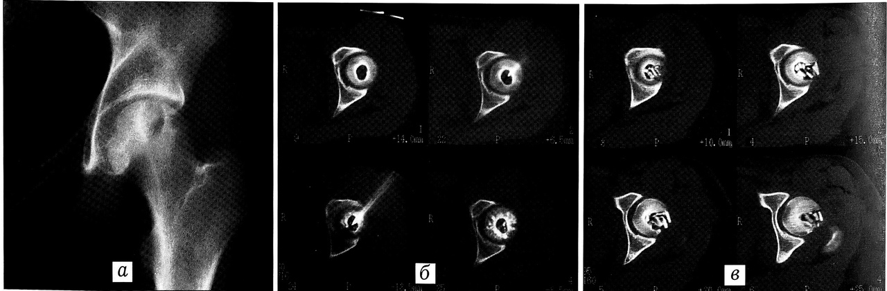 Рис. 6. Больная М. 11 лет. Хондробластома проксимального эпифиза левой бедренной кости. а — рентгенограмма, б — компьютерная томограмма до операции: дифференциальная диагностика с дистрофическими кистами головки бедра. Остеолитическая деструкция проксимального эпифиза левой бедренной кости, отграниченная зоной склероза. Произведена прицельная биопсия под контролем КТ с контрастированием. Контрастное вещество распространилось вокруг очага, что свидетельствует о наличии в нем ткани; в — компьютерная томограмма после операции (субхондральная околосуставная резекция головки бедра, пластика дефекта перфорированными поверхностно-деминерализованными аллотрансплантатами).