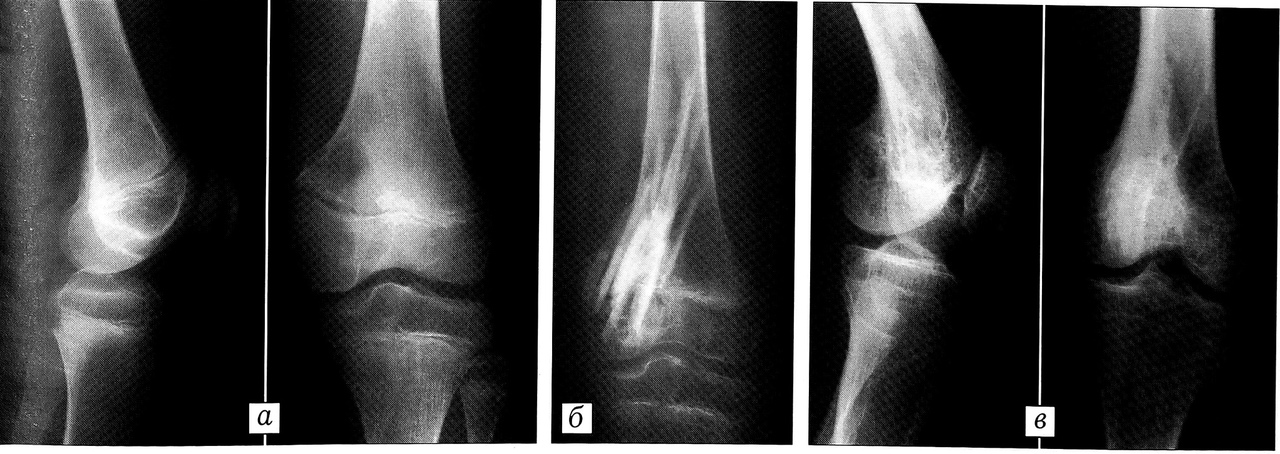 Рис. 8. Больной Т. 9 лет. Хондробластома дистального метаэпифиза левой бедренной кости. a — рентгенограммы до операции; б — непосредственно после операции (околосуставная резекция дистального метаэпифиза левой бедренной кости, пластика дефекта кортикальными аллотрансплантатами); в — рентгенограммы через 4 года после операции: рецидива нет, груботрабекулярная перестройка кости в зоне операции, закрытие зоны роста по внутренней поверхности, варусная деформация конечности на уровне левого коленного сустава.