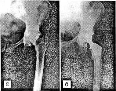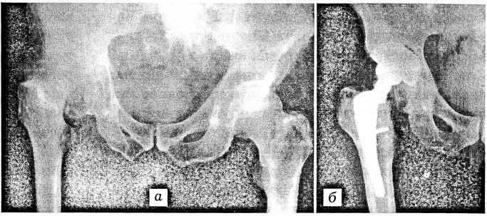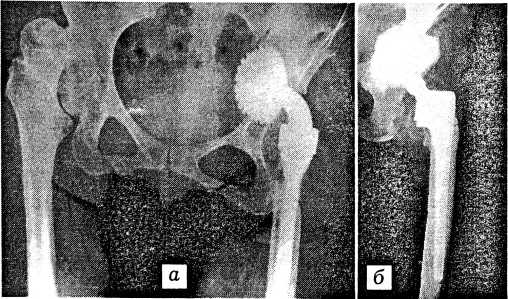 а — до операции; б — после тотального эндопротезирования левого тазобедренного сустава протезом «Віоmet».