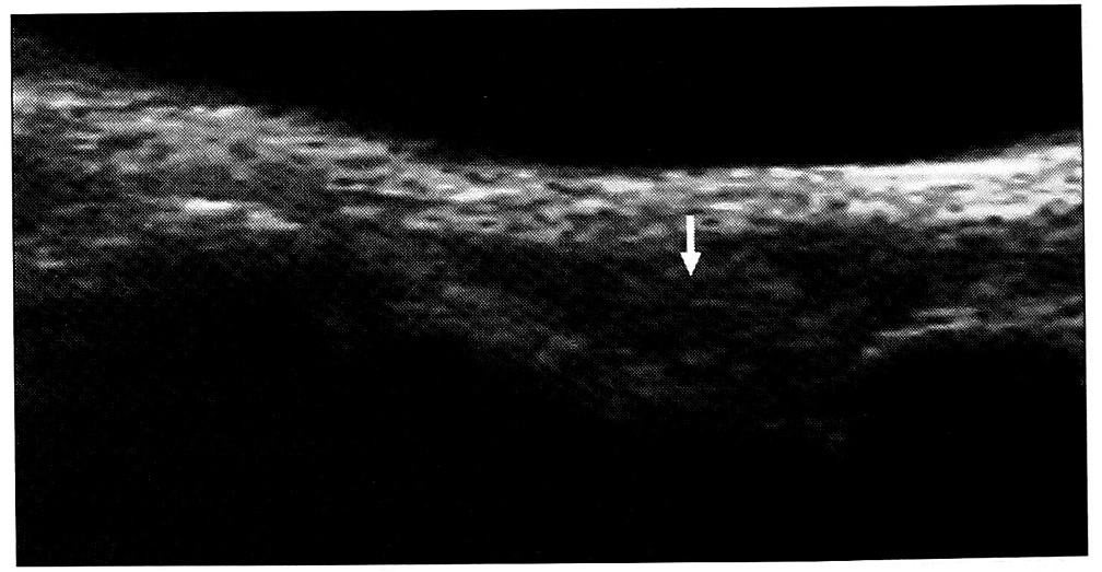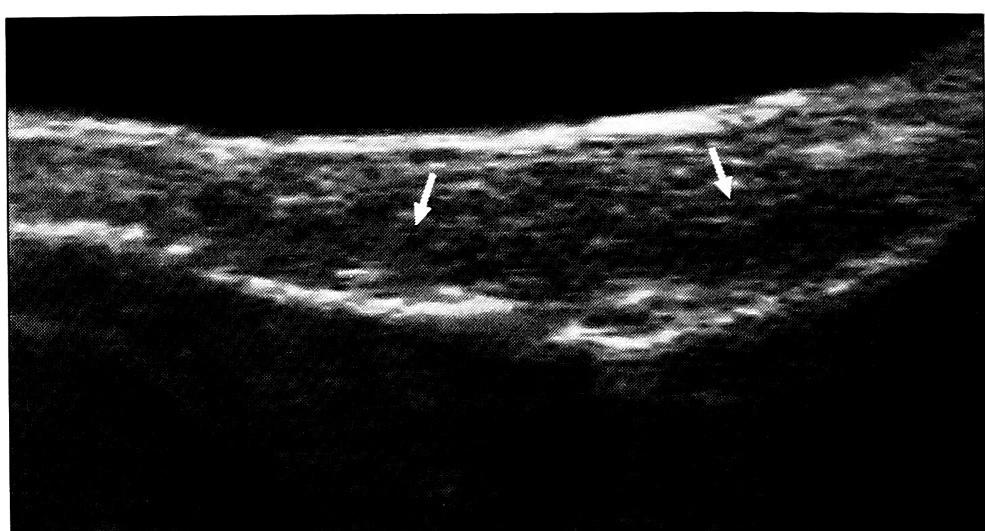 Рис. 6. Продольная сонограмма сухожилий сгибателей III пальца на ладонной поверхности кисти. Определяется зона пониженной эхогенности неоднородной структуры — явления теносиновита (стрелка). Диаметр сухожилий уменьшен, дифференцированная волокнистая структура утрачена (симптомы, характерные для дистрофических изменений сухожилий)
