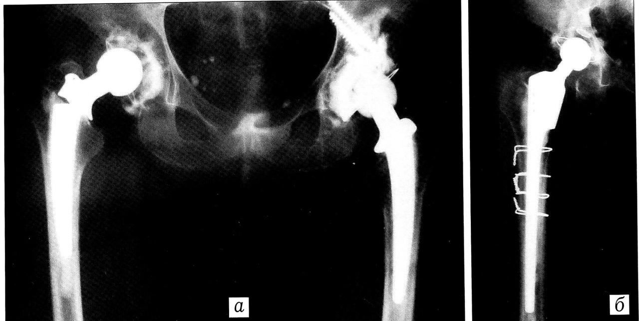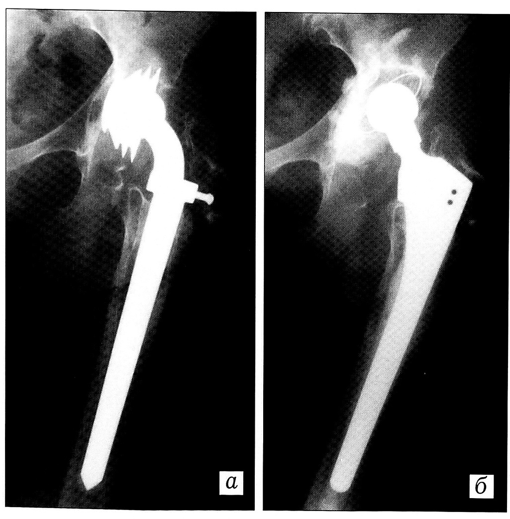 Рис. 1. Рентгенограммы больной 59 лет. а — перелом ножки эндопротеза (Poldi) правого тазобедренного сустава; б — состояние после ревизионного тотального эндопротезирования цементируемым протезом ЭСИ с использованием «скользящей» обширной остеотомии большого вертела и дополнительной фиксацией серкляжными швами.