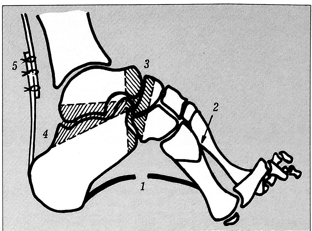 Рис. 1. Схема операции трехсуставного артродеза и вмешательства на сухожильном аппарате. 1 — рассечение подошвенного апоневроза; 2 — V-образная остеотомия I плюсневой кости; 3 — клиновидная резекция по суставу Шопара с иссечением клина к тылу и кнаружи; 4 — клиновидная резекция по подтаранному суставу с иссечением клина кзади и кнаружи; 5 — удлинение ахиллова сухожилия в сагитттальной плоскости с пересечением внутренней порции у места прикрепления к пяточной кости.