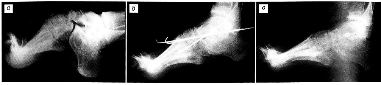 Рис. 2. Рентгенограммы правой стопы больного К. 23 лет. Диагноз: эквино-экскавато-варусная деформация стоп на почве болезни Фридрейха. a — до операции; б — непосредственно после операции; в — через 3 года.