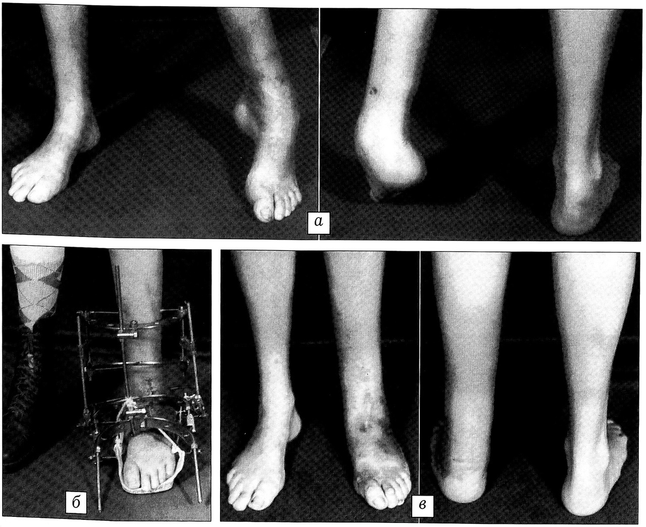 Устранение деформаций стоп у больных данной группы проводилось путем закрытого наложения шарнирно-дистракционного аппарата Волкова—Оганесяна с последующей дозированной коррекцией и длительной (2~3 мес) стабильной фиксацией в аппарате. Затем осуществлялась гипсовая иммобилизация (2-3 мес) для формирования удерживающей от рецидива рубцовой ткани. С этой же целью назначали обязательное пользование ортопедической обувью и ночными фиксирующими шинами из