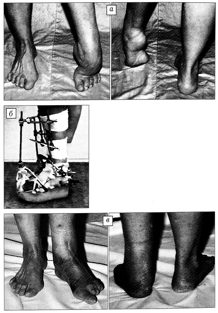Рис. 4. Больной Ш. 54 лет. Диагноз: тяжелая эквино-экскавато-варусная деформация левой стопы на почве перенесенного в детстве полиомиелита. a — до операции;б — в процессе лечения;в — после операции.