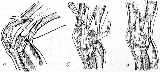 Рис. 1. Схема задней мобилизации коленного сустава. а — рассечение подвздошно-берцового тракта и сухожилия двуглавой мышцы бедра; б — отпрепаровка наружной головки икроножной мышцы от задней поверхности мыщелка бедра и рассечение задней капсулы сустава, защита седалищного нерва; в — сшивание рассеченного тракта и сухожилия бицепса с удлинением.