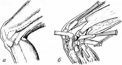 На 6 коленных суставах задняя мобилизация была дополнена отсечением приросшего к мыщелкам бедра надколенника, которое производили из небольшого дополнительного разреза по передневнутренней поверхности коленного сустава или из продленного разреза для задней мобилизации по наружной поверхности (рис. 2, а). В этих случаях полость коленного сустава была в большей ее части облитерирована. При выполнении данной остеотомии важно не травмировать мыщелки бедра, допустимо оставить часть приросшей к бедру костной ткани надколенника. Главная задача — получить подвижный надколенник, который не препятствовал бы разгибанию коленного сустава. Окончательное формирование надколенника и мыщелков бедра целесообразно оставить на второй этап оперативного лечения.