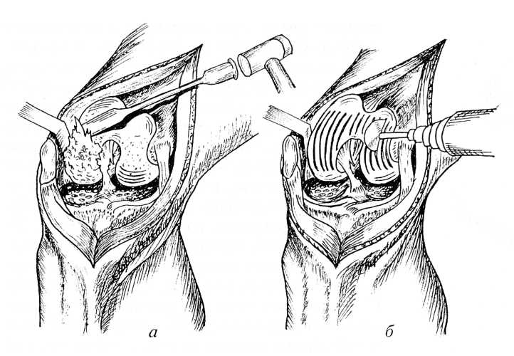 Экономно снимали долотом субхондральную костную пластинку с суставной поверхности бедра, обнажая кровоточащую спонгиозную кость мыщелков. Остатки субхондральной кости на большеберцовой суставной поверхности перфорировали сверлом. Надколенник частично резецировали на 1/2—1/3 толщины во фронтальной плоскости и производили пластику его суставной поверхности лоскутом, взятым из широкой фасции бедра. Поскольку субхондральная кость является непреодолимым препятствием, своеобразным блокатором для стволовых клеток, основной целью этих действий было открытие доступа к источнику регенерации — стромальным клеткам костного мозга, а также создание максимально свободной полости коленного сустава, в которой будет происходить движение суставных концов.