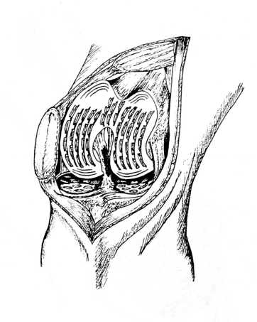 Они и создают диастаз между суставными поверхностями. Между рядами хрящевых дисков остается обнаженная спонгиозная кость, защищенная от травматизации выступающими краями дисков. При таком чередовании участков свободной спонгиозной кости и имплантированного интерпозиционного материала не создается препятствий для регенерации из эндостальных элементов губчатой кости и последующей утилизации пересаженного аллохряща, а также для возможного индукционного влияния аллохряща на преобразование тканевого регенерата в хрящевую ткань.