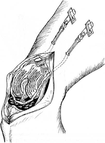 Применение дренажной петли преследует еще одну чрезвычайно важную цель — борьбу с послеоперационным внутрисуставным спаечным процессом.