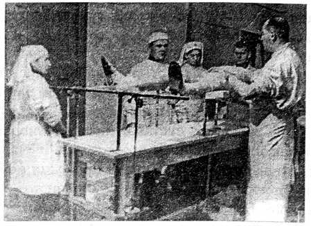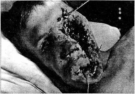 В челюстно-лицевое отделение (75 коек) поступали раненые со сложными ранениями, нуждающиеся в шинировании челюсти, с тяжелыми ранениями лица, челюстей, сочетающимися с ранением глаз и лобных полостей, пульсирующими гематомами и кровотечением при ранении челюстной артерии и языка (рис. 2—4).