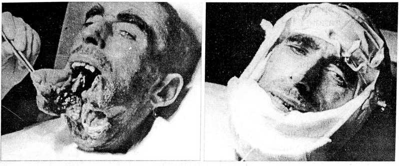Рис. 3. Ранение нижней челюсти, лица, ротовой полости (до и после операции).