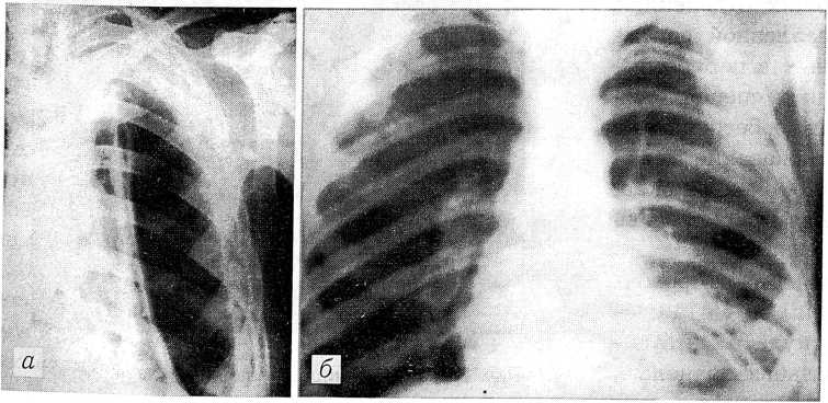 Рис. 5. Рентгенограммы раненого с проникающим ранением левой половины грудной клетки. а — гемопневмоторакс, смещение средостения; б — после постоянного вакуумирования на электроаппарате Каплана: расправление легкого, нормальное положение средостения.