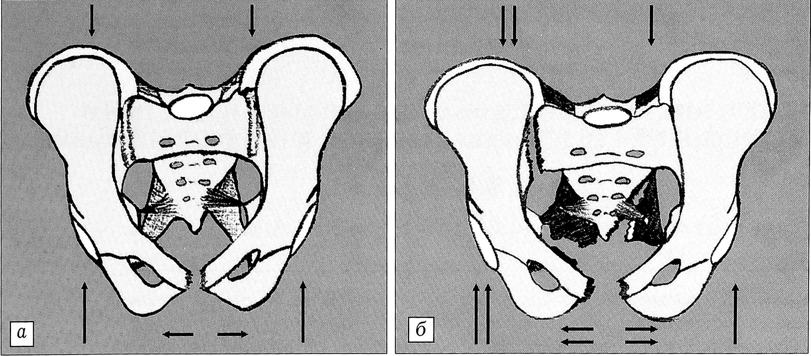Повреждения тазового кольца имеют комплексный механизм. Они возникают в результате сильного сдавления или удара в сагиттальном, фронтальном и вертикальном направлениях, что характерно при дорожно-транспортных происшествиях, падениях с высоты и сдавлении [8, 10, 13]. Главными силами, действующими на таз, являются ротация кнаружи, ротация внутрь и вертикальные сдвигающие силы. Ротационные воздействия имеют место при прямом ударе в область задневерхнего отдела или при значительной внутренней ротации с одной или двух сторон. Эти силы обычно вызывают разрывы лобкового симфиза. Сочленение расходится до максимума в 2,5 см, но ввиду интактности крестцово-подвздошных связок такие повреждения считаются стабильными — типа «открытой книги» I степени [13, 14] (рис. 1, а). При дальнейшем воздействии происходит разрыв крестцово-остистых и крестцово-подвздошных связок. Смещающие усилия в вертикальной плоскости приводят к значительному повреждению мягкотканных структур, к нестабильности тазового кольца с передним или задним смещением половины таза, повреждению крестцово-подвздошного сочленения. Теперь симфиз может разойтись более чем на 2,5 см — повреждение типа «открытой книги» II степени. Для повреждений типа «открытой книги» III степени характерны дополнительные травмы мягкотканных образований области таза: кожи, влагалища, уретры, мочевого пузыря, прямой кишки [13] (рис. 1, б).