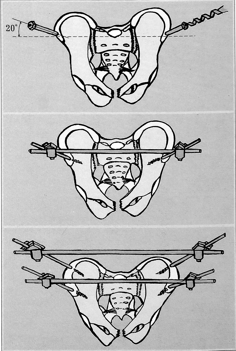 Техника операции. Под наркозом после обработки кожных покровов делали укол-разрез над серединой гребня передневерхней ости подвздошной кости. Через втулку производили рассверливание подвздошной кости в глубину ее тела под углом 20° к горизонтальной оси. Метчиком намечали канал для введения специального винта. По сформированному каналу вкручивали винт до жесткого упора в костную ткань — на глубину не менее 7-9 см, т.е. на большую часть его длины. С противоположной стороны таза в тело подвздошной кости аналогичным образом вводили другой винт. Винты соединяли между собой поперечной штангой. Это наиболее простая компоновка аппаратов, монтаж которой занимал не более 30 мин. Обычно мы пользовались более жесткой системой фиксации из двух, а иногда и трех штанг. Для этого вводили дополнительные винты в тела подвздошных костей через их гребни симметрично с обеих сторон таза (рис. 2).