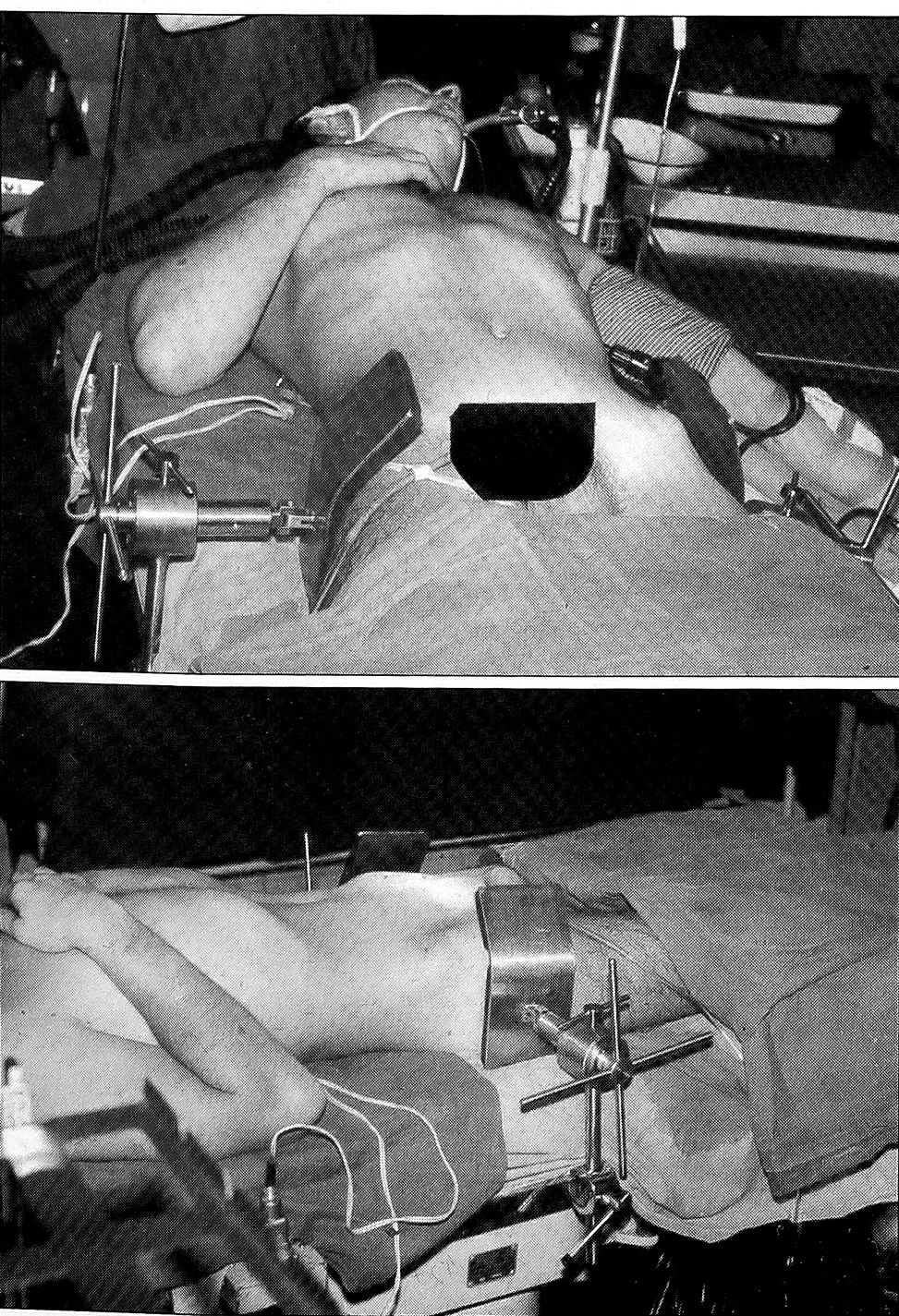 В целях снижения травматичности операций, особенно в случае застарелых повреждений, мы применяли разработанное нами «Устройство для репозиции костей таза» (пат. 2115390 РФ от 18.05.95), предназначенное для обеспечения сжатия костей таза при свежих и застарелых разрывах лобкового симфиза. Устройство крепится непосредственно к операционному столу на стойках (стандартных струбцинах) с обеих сторон таза. Репонирующие элементы регулируются таким образом, чтобы каждая их изогнутая часть прилегала к тазу больного в области тазобедренных суставов. Под наркозом производится сжатие таза в горизонтальной плоскости путем постепенного продольного перемещения сдавливающих пластин посредством винтового механизма. Репозиция контролируется визуально и пальпаторно (рис. 3). При помощи данного устройства нам удавалось полностью устранить или уменьшить диастаз в поврежденном лобковом симфизе даже в сроки до 2 мес после травмы. До начала операции с целью профилактики возможного повреждения мочевого пузыря вводили катетер для пассивного оттока мочи. Для обнажения симфиза мы использовали надсимфизарный поперечный разрез типа Pfannenstiel. Этим путем по внутреннему краю лонного сочленения подходили к фасции и затем к самой кости. Обе прямые мышцы живота отделяли от мест их прикрепления. Сдвигали поднадкостнично до лонных костей приводящие мышцы с обеих сторон. Внутреннюю поверхность лонных костей обходили изогнутым распатором во избежание травматизации венозной сети, которая располагается под костью и позади нее.