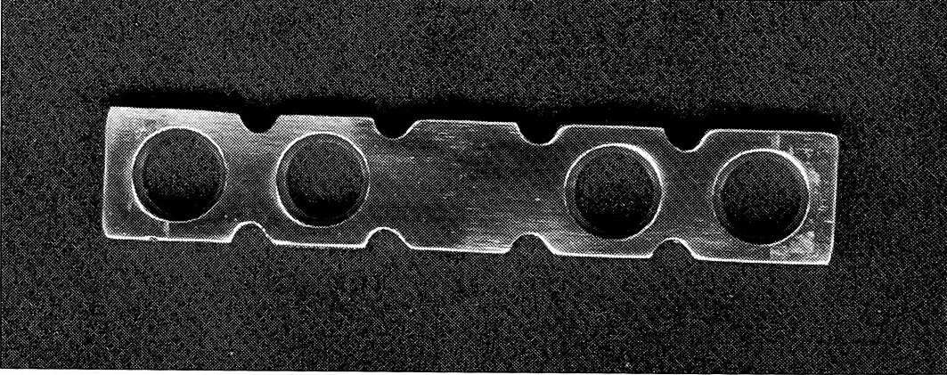 Верхний край лобкового симфиза скелетировали, а волокнистый хрящ, соединяющий лобковые кости, частично или полностью удаляли с обеих сторон костей. Это было необходимо потому, что хрящевая ткань при разрывах симфиза препятствует костному сращению. После обнажения симфиза и выполнения гемостаза производили сдавление лобкового сочленения тазовым устройством до достижения минимального расстояния между лонными костями (не более 0,5 см). Тазовую пластину (рис. 4) крепили по верхнему краю лобковых костей с двух сторон четырьмя спонгиозными винтами. Операцию заканчивали дренированием раны и наложением тазового армированного бандажа. Контролировали цвет мочи, катетер оставляли на сутки. Через 2 нед больным разрешали поворачиваться на бок, через 3 нед они начинали ходить с помощью костылей, а через 2 мес — без дополнительной опоры.