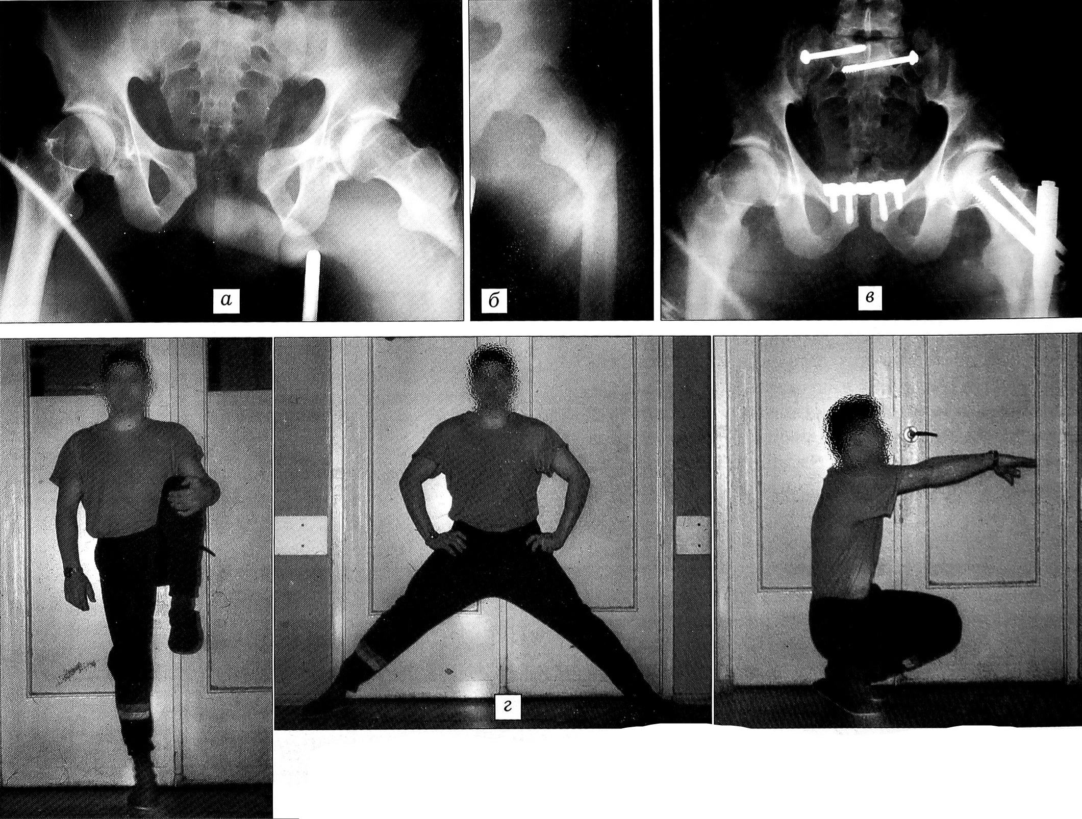 Клинический пример. Больной Н.,35 лет, доставлен в реанимационное отделение института через 12 ч после травмы — падения с высоты 17 м. Диагноз — сочетанная травма: черепно-мозговая травма; нестабильный перелом костей таза типа ВЗ — разрыв лобкового симфиза и обоих крестцово-подвздошных сочленений (рис. 5, а); косой оскольчатый перелом левого бедра (рис. 5, б), перелом правого предплечья, перелом левой пяточной кости, перелом обеих лодыжек левой голени; шок II степени. Через 11 дней, после стабилизации состояния больного, произведены одномоментно восстановление лобкового симфиза тазовой пластиной, обоих крестцово-подвздошных сочленений спонгиозными винтами типа АО и закрытый блокирующий остеосинтез отломков бедренной кости системой PFN (рис. 5, в). Функциональный результат лечения через 8 мес после травмы представлен на рис. 5, г.