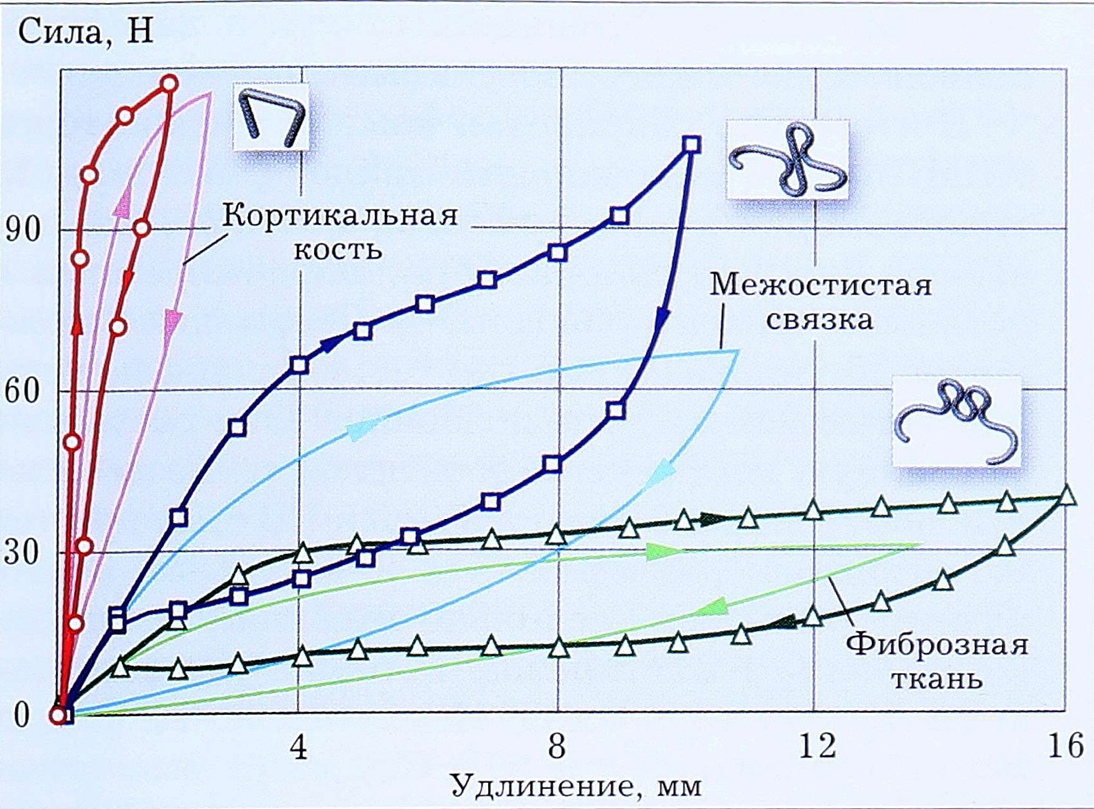 Было показано, что поведением, наиболее близким к механическому поведению кости, обладают П-образные фиксаторы, а хрящевым и связочным структурам соответствуют петельные конструкции (рис. 1).