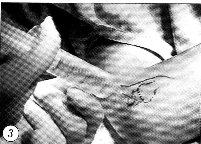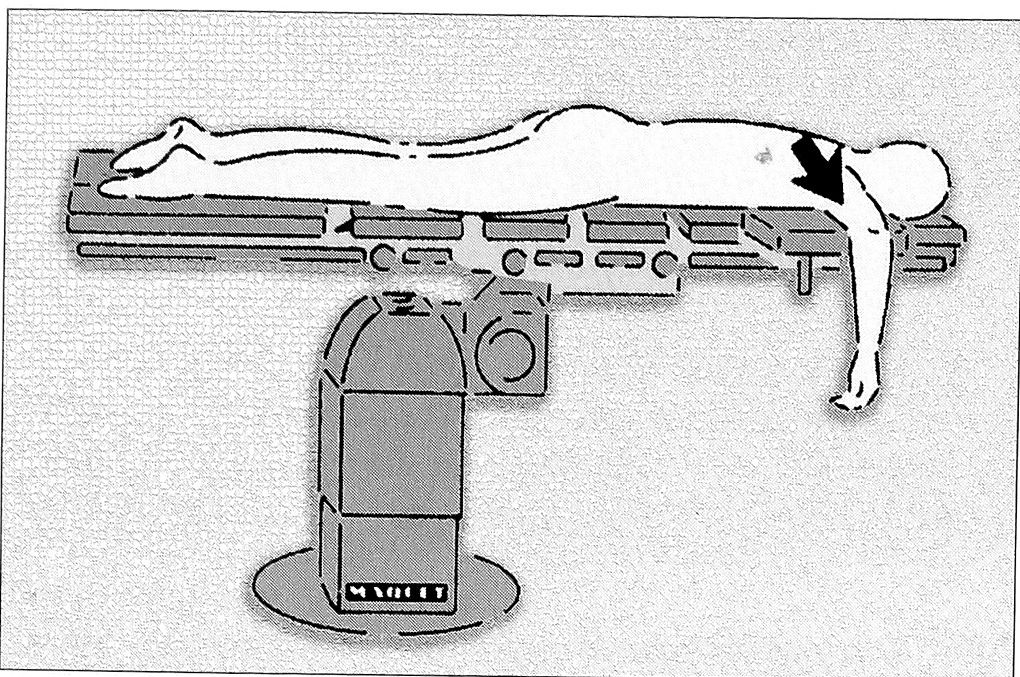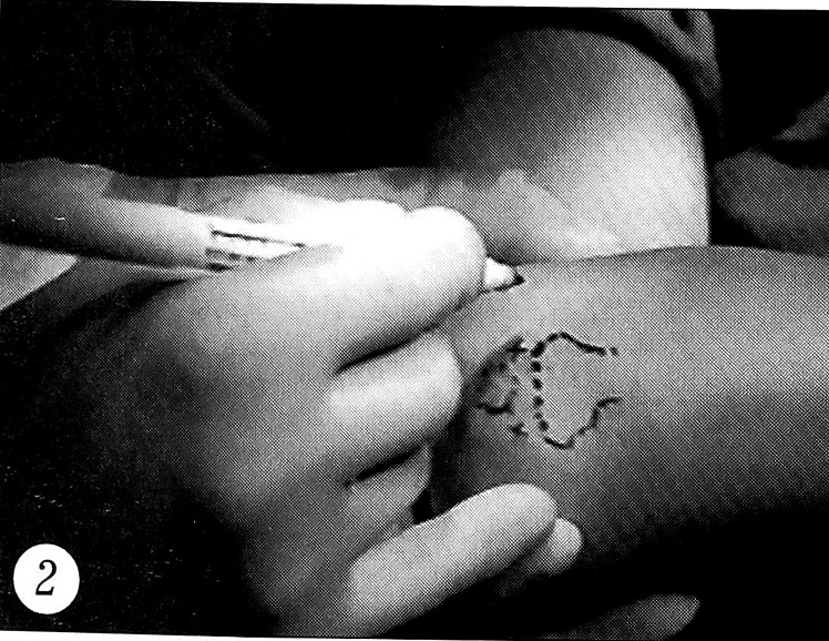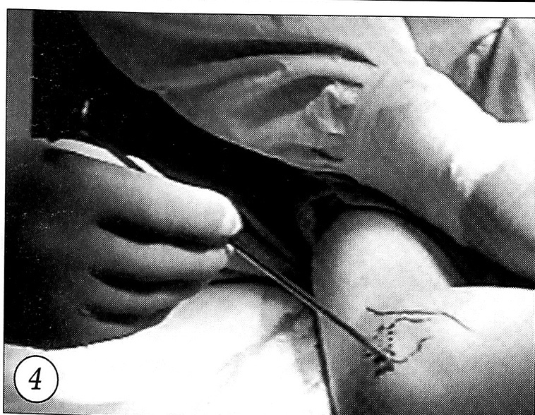 Артроскопию выполняли под общим обезболиванием. Наиболее удобным положением пациента на операционном столе, по нашему мнению, является положение на животе при свешенном вниз локтевом суставе (рис. 1). Производили маркировку суставных структур (рис. 2) и пункцию локтевого сустава через задний лучевой доступ с целью растяжения суставной капсулы путем введения 5~ 20 мл физиологического раствора (рис. 3). Делали операционный надрез кожи в области предполагаемого доступа «тупым» способом, прижимая скальпель к коже и смещая ее относительно лезвия. Такая методика позволяет гарантированно произвести только поверхностный операционный надрез кожи без повреждения других структур. Использование «колющего» доступа скальпелем недопустимо в связи с опасностью повреждения глубокой ветви лучевого нерва.