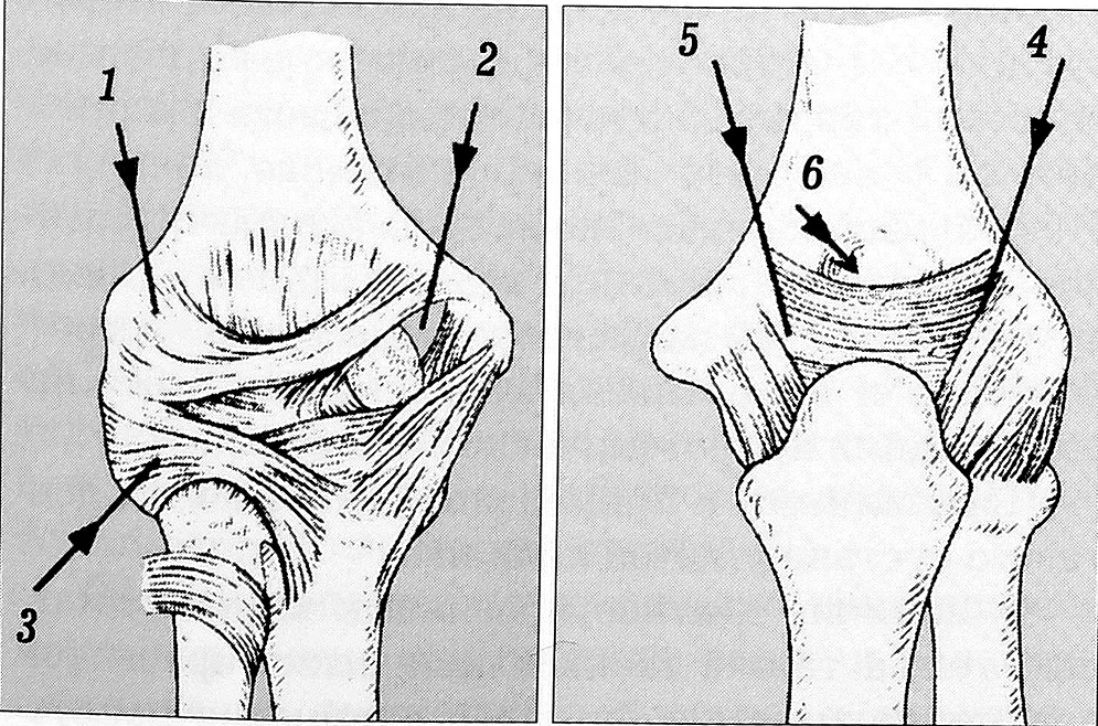 Рис.5. Основные (1, 2, 3, 4) и дополнительные (5, 6) артроскопические доступы.