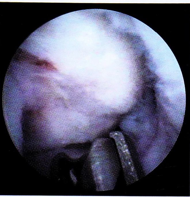 Следующим этапом вводили тупой троакар, ось которого направляли строго к центру локтевого сустава (рис. 4). Методика тупого доступа при выполнении артроскопии локтевого сустава значительно снижает вероятность повреждения хряща и нейроваскулярных структур. Затем вводили шахту артроскопа и подключали артроскопическую камеру, а также ирригационную систему.