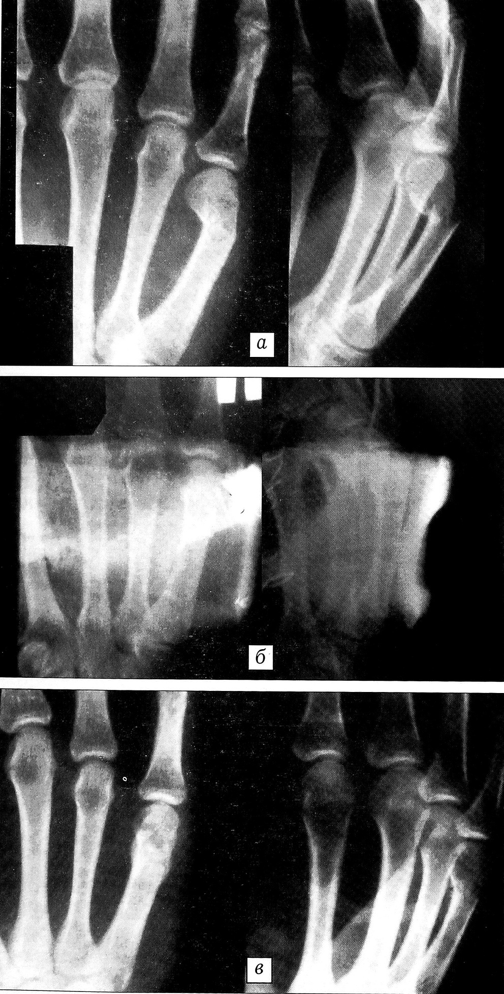 Больной Р.,31 года. Диагноз: закрытый перелом шейки V пястной кости правой кисти со смещением отломков. Травму получил при ударе во время драки. На рентгенограмме при поступлении (см. рисунок, а): косопоперечный перелом шейки V пястной кости со смещением по ширине и под углом, открытым к ладони. Через 4 ч после травмы под местной анестезией выполнена закрытая репозиция, наложена короткая гипсовая повязка. На контрольной рентгенограмме (б): смещение устранено. Гипсовая повязка снята через 4 нед, на рентгенограмме без гипса (в): положение отломков правильное. Больной осмотрен через 2 мес после травмы: сгибание и разгибание в пястно-фаланговом суставе в полном объеме, деформации пястья нет.