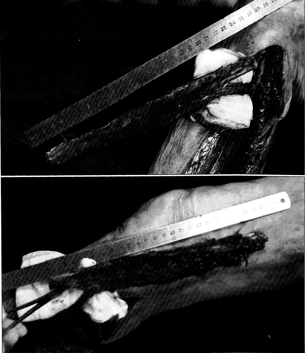 При дефектах мыщелковой и надмыщелковой зон бедренной кости мы сочли целесообразной транспозицию диафиза малоберцовой кости на бедро без пересечения питающей сосудистой ножки с целью повышения надежности пересаживаемого трансплантата. Основанием для такого заключения послужили результаты проведенных анатомических исследований. Мы выделяли максимально длинный малоберцовый трансплантат, сохраняя питающие его малоберцовые сосуды (рис. 1), и измеряли длину и диаметр сосудистой ножки, уровень возможного расположения трансплантата на бедре. В итоге мы убедились в возможности транспозиции малоберцовой кости на дистальный метаэпифиз бедра без нарушения ее питания.
