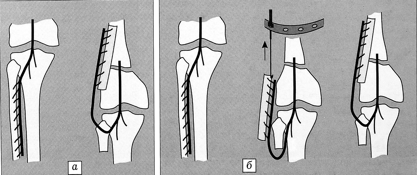 Рис. 2. Схема транспозиции малоберцовой кости.a — без удлинения сосудистой ножки и сегмента конечности; б — с удлинением сосудистой ножки.
