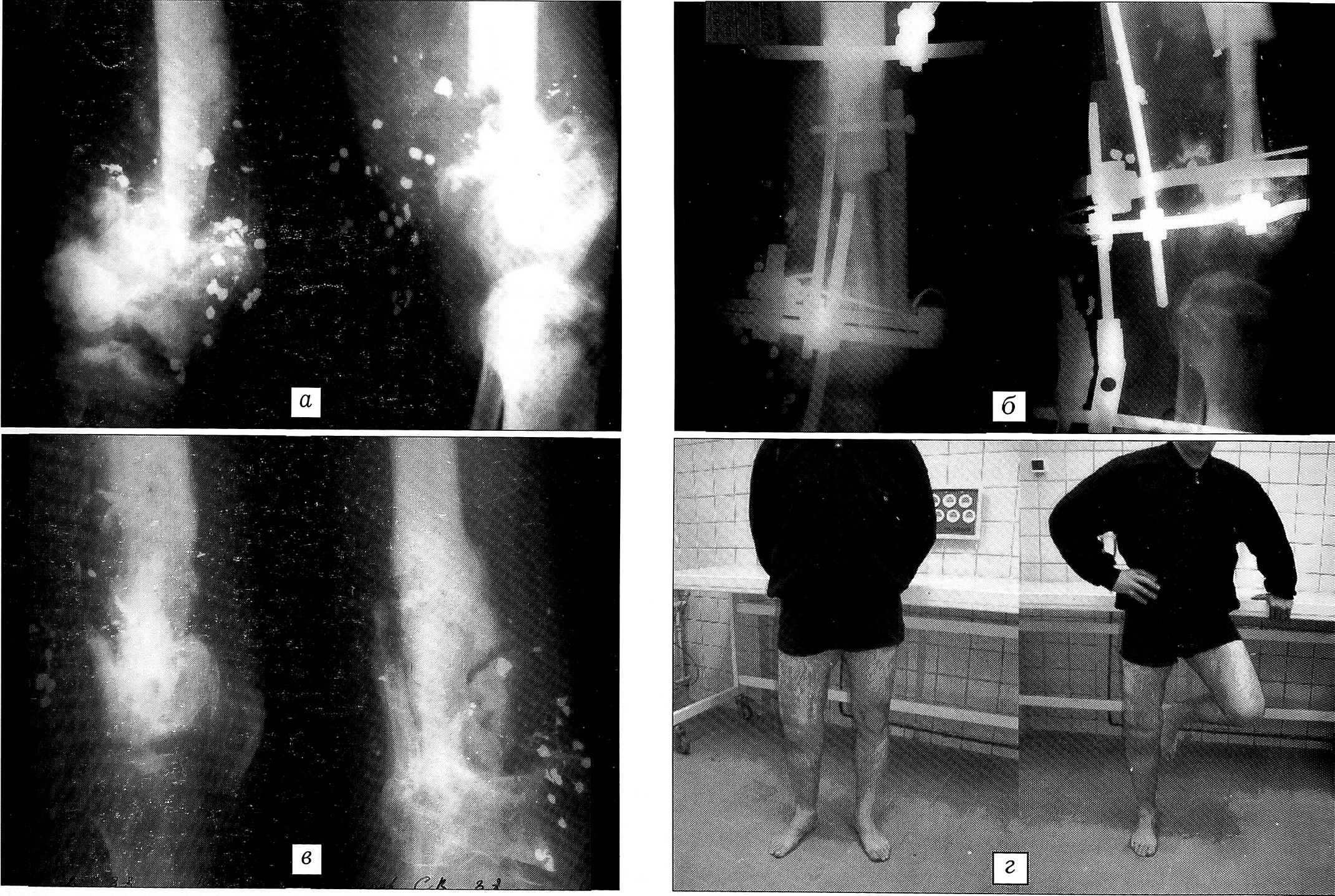 Больной П.,36 лет, получил во время охоты огнестрельное дробовое ранение правого бедра с многооскольчатым переломом дистального метаэпифиза. Перелом осложнился развитием флегмоны бедра, по поводу чего выполнялись некрэктомии с удалением свободных костных фрагментов. После купирования острого гнойного процесса была предпринята попытка сращения бедренной кости в аппарате Илизарова, которая не удалась из-за обострения воспаления на бедре. Спустя 6 мес пациент обратился в отделение ортопедии ЦКБ РАН «Узкое», где ему была произведена транспозиция васкуляризованной малоберцовой кости одноименной голени с фиксацией в спицестержневом аппарате. Нагрузка на оперированную конечность начата на 2-е сутки после операции. На 14-е сутки больной выписан на амбулаторное лечение. Через 2 мес после операции отмечены признаки первичной консолидации. Аппарат был заменен на ортез. Внешняя фиксация прекращена через 8 мес после костной пластики, опорность конечности восстановилась (рис. 4).