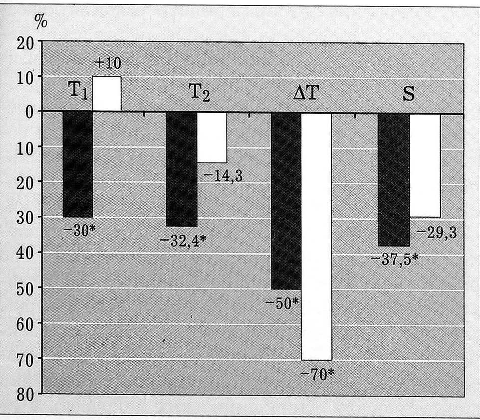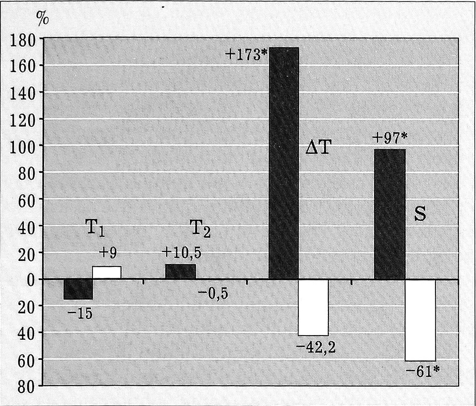 Рис. 1. Степень изменения термографических показателей (в %) в дорентгенологической стадии болезни Пертеса, перешедшей в последующем в I стадию асептического остеонекроза.Изолиния — аналогичные показатели при реактивном синовите, не перешедшем в I стадию болезни Пертеса. Темные столбцы — передняя проекция бедра, светлые — задняя проекция. * р<0,05 (в остальных случаях р>0,05).