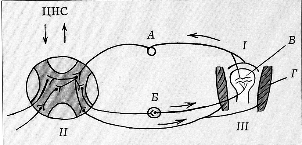 Рис. 3. Ключевые звенья патогенеза нейродистрофического синдрома при болезни Пертеса.А — чувствительный спинномозговой узел, Б — симпатический ганглий, В — сосудистая сеть головки бедра, Г — поперечно-полосатые мышцы бедра и тазобедренного сустава; I — патологические афферентные влияния на фоне дисплазии тканей и сосудов тазобедренного сустава в процессе роста и/или возможных микротравм; II — нарушения межнейронных взаимосвязей спинальных центров с вовлечением соседних нейронов; III — расстройства эфферентных нейрососудисто-тканевых взаимосвязей тазобедренного сустава на фоне гипоплазии сосудов головки бедра.