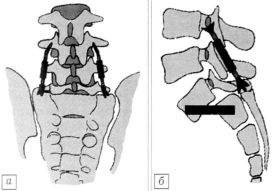 Рис. 1. Схема двухэтапной операции: фиксация пояснично-крестцового отдела двумя дистракторами Казьмина (а) и передний спондилодез L5-S1 кортикальным трансплантатом (б).