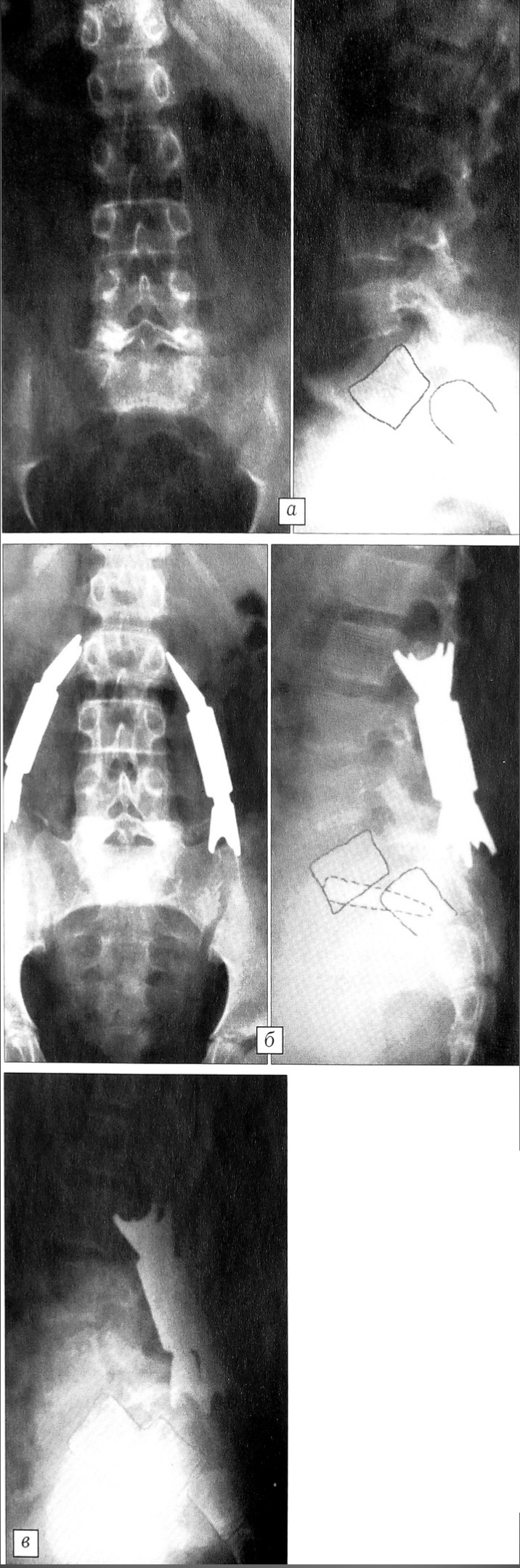 Рис. 2. Рентгенограммы больного А. 8 лет. Диагноз: спондилолизный спондилолистез L5 позвонка III степени.a — до операции;б — после операции: редукция до II степени;в — через 8 лет после операции: редукция смещения практически до I степени.