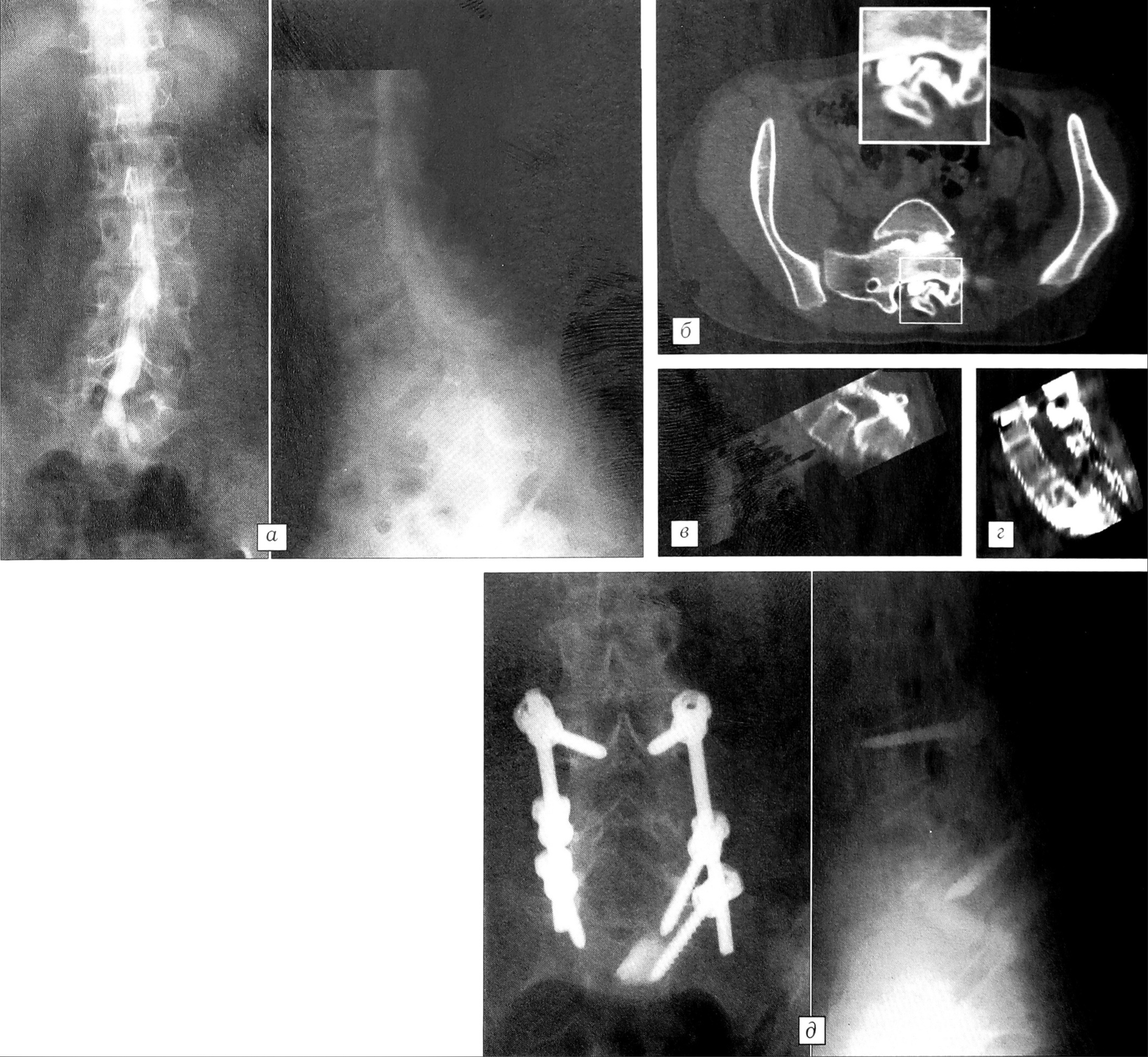 Рис. 3. Больная Л. 14 лет. Диагноз: спондилолизный спондилолистез L5 позвонка IV степени, диспластический левосторонний пояснично-крестцовый сколиоз III степени.a — миелограммы, б — компьютерная томограмма при поступлении: на КТ выраженная дисплазия дуги L5 позвонка и ее инвагинация со стенозом позвоночного канала;в — сагиттальная компьютерная реконструкция до операции, г — после операции;д — рентгенограммы после операции (ламинэктомия L5 с транспедикулярной фиксацией системой Moss-Miami, передний спондилодез).