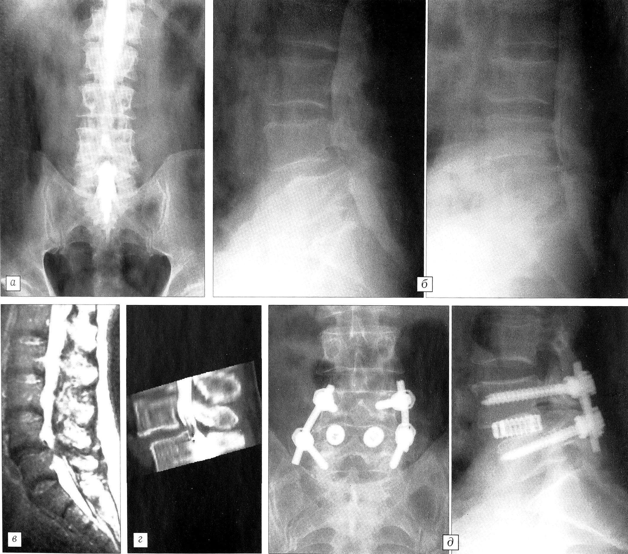 Всем больным проводили стандартную рентгенографию пояснично-крестцового отдела в прямой и боковой проекциях, а также функциональную рентгенографию. С помощью специальных методов исследования (миелография, КТ, МРТ) визуализировали состояние дурального мешка и позвоночного канала. При клиническом обследовании во всех случаях оценивали как ортопедический, так и неврологический статус больного.