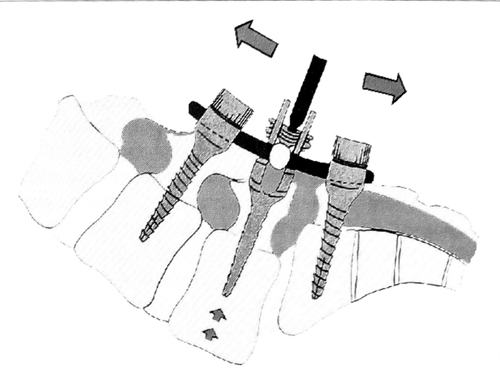 Актуальным является вопрос о необходимости и степени редукции. При начальных степенях спондилолистеза, особенно у детей и подростков, вправление смещенного позвонка не представляет большой трудности, так как костно-фиброзные изменения у них не выражены. В отношении более тяжелых степеней спондилолистеза мнения расходятся. Ряд авторов считают, что необходимо производить максимальное вправление смещенного позвонка, а если это невозможно, прибегать к восстановлению пояснично-крестцовых взаимоотношений путем резекции смещенного пятого поясничного позвонка и формированию спондилодеза между L4 и S1 позвонками [13]. Другие авторы не одобряют такой радикализм, сообщая о большом числе неврологических осложнений после подобного рода операций. В ряде публикаций высказывается мнение, что при тяжелых смещениях производить редукцию вообще не надо, а следует ограничиться фиксацией путем создания спондилодеза [12]. Мы, основываясь на своем опыте, считаем, что к этому вопросу надо подходить дифференцированно. Так, если при использовании дистракторов можно лишь условно говорить о редукции, то транспедикулярные конструкции позволяют проводить вполне адекватное вправление из заднего доступа [7, 23, 24]. Редукция при применении транспедикулярных конструкций происходит благодаря подтягивающему действию через проведенный в смещенный позвонок винт за счет эффекта рычага при установке и фиксации отмоделированного стержня или пластины на винты, проведенные в вышеи/или нижележащие позвонки, либо благодаря эффекту «штопора» при использовании конструкции Moss-Miami (рис. 5). При спондилолистезе I—II степени у детей и подростков можно произвести практически полную редукцию без каких-либо осложнений. У взрослых при этих степенях спондилолистеза мы также достигали практически полной редукции при применении транспедикулярных конструкций в сочетании с задним межтеловым спондилодезом. При спондилолистезе III-IV степени и спондилоптозе, если деформация мобильна, то у детей и подростков можно проводить редукцию — насколько это удается без применения значительных усилий. У больных более старшего возраста, учитывая сформировавшиеся компенсаторные механизмы, мы не считаем необходимым выполнять редукцию любой ценой, отдавая приоритет надежной фиксации на уровне смещения для предотвращения прогрессирования листеза и усугубления клинических проявлений. При этом как у взрослых, так и у детей с тяжелыми степенями спондилолистеза при проведении редукции мы считаем необходимым выполнение ламинэктомии на уровне пятого поясничного позвонка для визуального контроля за натяжением невральных структур позвоночного канала.