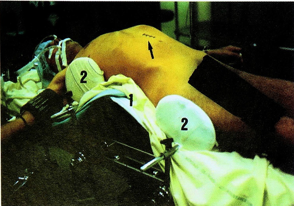 Рис. 1. Положение пациента на операционном столе. Специальная опора (1) располагается в проекции зоны операции так, чтобы получить максимальный лордоз. Опора справа (2) позволяет максимально сместить пациента в соответствующую сторону. Оператор находится справа от пациента.